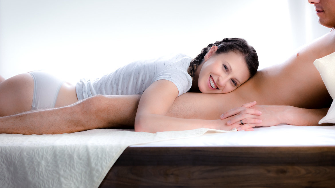 Vivacious brunette Emylia Argan is tussling with her lover Nick Ross on the bed, as Andrej Lupin’s erotic movie “About Us” begins. Bathed in light, the lovers laugh, talk and kiss tenderly, Emylia stroking her man’s stiffening cock through his briefs before taking it between her lips. The pigtailed beauty sucks Nick’s thick erection with slow intensity, bobbing her head to take it deeper with each stroke. It’s rigid as Nick pulls up Emylia’s dress to nuzzle her big breasts, then rubs his nose in her fluffy bush as he licks and fingers her pussy until she’s shivering with pleasure. She’s dripping wet as Nick slides his dick inside her, thrusting steadily, her boobs jiggling to the rhythm. They switch to cowgirl, her luscious ass rippling as she rises and falls on his slick pole, riding to a powerful orgasm. She cums again rapidly, and they return to missionary, Emylia climaxing again before jerking Nick’s load out over her creamy skin.