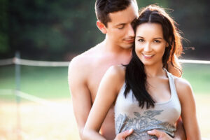 As “Hold Me Baby” begins, cute Asian college girl Katana comes running down the street to jump into the arms of Maxmilian Dior, looking so sexy in her white T-shirt and little plaid skirt, ankle socks and white pumps. The sweet lovers kiss and listen to music as they walk home together; as soon as they reach Katana’s backyard she straddles her man, grinding on his lap. Maxmilian sucks on Katana’s tiny titties and she slides to her knees, tugging down his shorts and stroking his stiffening dick, slapping it against her tongue and sliding her lips up and down around his thick shaft. Peeling off her white cotton panties, Katana sits astride Maxmilian and guides his cock into her tight little pussy, humping vigorously, rising and falling as she rides him. She’s glistening with perspiration as Maxmilian flips her onto her back; even then she can’t stop rocking and bucking, thrusting back at him, until she’s got her leg over his shoulder and two fingers grinding her clit urgently. He pumps into her deep and hard, lips on her dark nipples, relishing her cries of pleasure as he fucks her through her orgasm. Katana squats to ride him even more energetically, until he shoots his load inside her, letting it trickle out of her soaked pussy, both utterly sated.