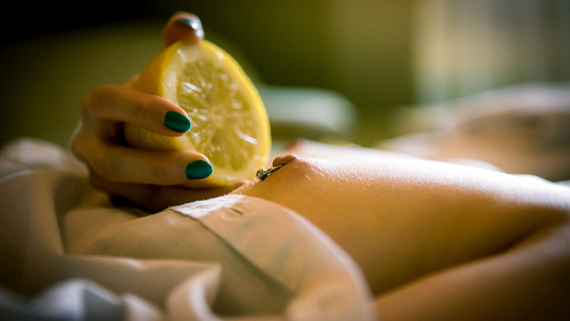 Sexy blonde Alice Crowley stars in this zesty serving of pleasure-pain kink from erotic movie auteur Paul Black. We find her slicing a large lemon into chunks, then squeezing out the juice against the glass wall of her shower. She laps it up, relishing its sharp flavor, as her free hand works between her thighs. Next, Alice is in a citrus-yellow room, sitting on the bed in a loose white shirt and black pantyhose. Her hair is long with blunt-cut Bettie bangs and her makeup is vampish and smoky, teamed with a metallic manicure. She loosens the shirt to expose her small, perfect breasts, lost in a lustful trance as she clamps a wooden clothespin to each nipple. Her pantyhose crotch is ripped to expose her shaved pussy, and she attaches clothespins to her fleshy lips. Then she takes a huge, whole lemon and grinds it against her snatch. Her fingers grab and massage her slit and mound – then she wedges a lemon half in her mouth. Gagged, she runs a double-headed Wartenberg pinwheel over her beautiful body and slaps her own face. She flicks the six clothespins clipped to her pussy lips before yanking them off roughly, leaving her pinched flesh marked with ridges. She rubs herself as sensation floods back in, then begins to masturbate, fingers dipping inside and strumming her clit. She bucks on the bed, head hanging off of the edge – and as she moans in ecstasy, the lemon-gag falls out her mouth and hits the floor. Her bracelets rattle as she pounds herself to an intense climax, then she caresses her pussy, before lying silent and motionless…
