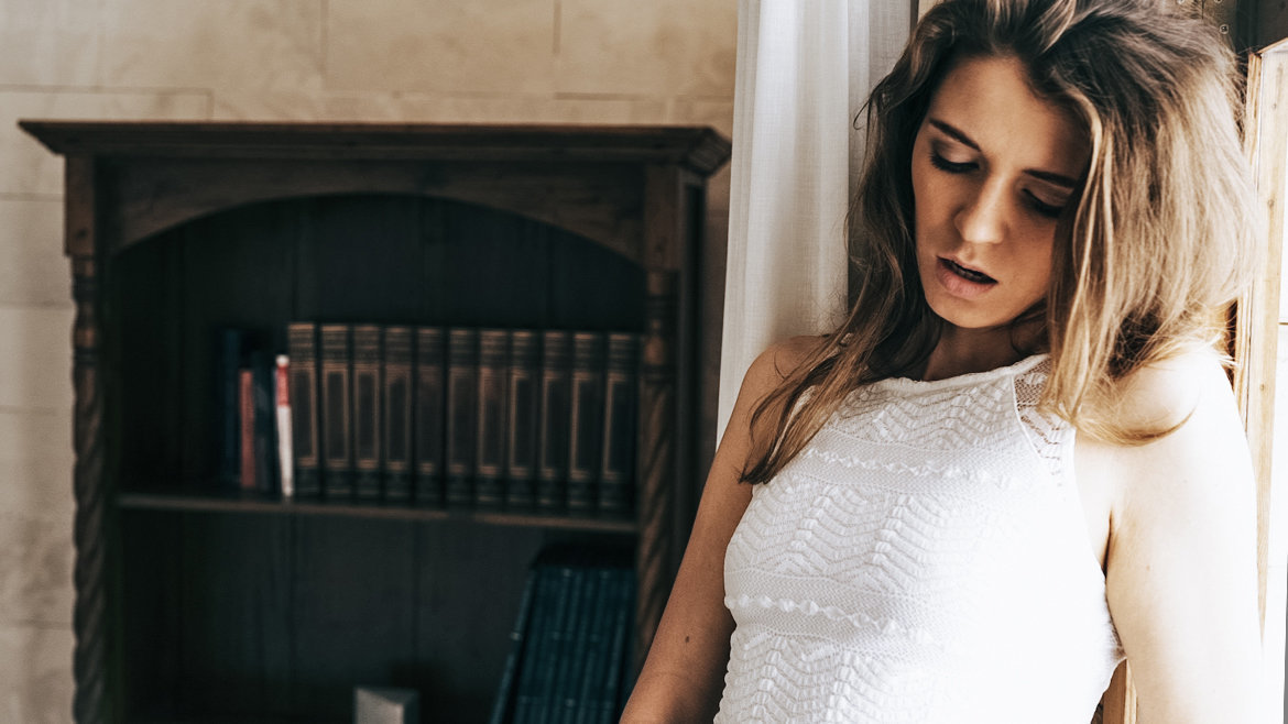 Gorgeous brunette Kalisy looks stunning in a skintight dress and heels, as she browses the bookshelves of her Mallorcan vacation villa. As Andrej Lupin’s erotic movie “Library” begins, the slender beauty’s mind wanders to more erotic pleasures, and she slides a hand into her white lace panties to touch herself. Kicking off her panties, she rubs her clit avidly, caressing her sexy small breasts with her free hand. Naked, she sits with thighs spread and fingerbangs her shaved pussy, then turns onto her knees with her perfect ass up to masturbate to an intense orgasm.