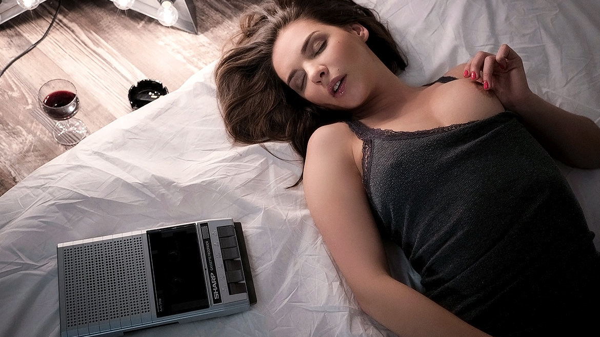 Henessy, a gorgeous brown-eyed brunette, enters her bedroom carrying a glass of wine. She’s casually dressed in a strappy gray camisole and cute ankle socks, with her long hair loose and minimal makeup. The room is sparsely decorated – her bed is a mattress on the wood floor, wrapped in a white sheet, lit by a star-shaped lamp. As she lies on the bed we see she is wearing no panties and has a shaved pussy. She lights a cigarette then switches on an old-school cassette-tape recorder, listening to the playback of orgasmic female moaning. As she enjoys this, smoking, her other hand gently caresses her beautiful body. She stubs out her cigarette and hits record, freeing one perfect breast and then the other from the top of her camisole. She strokes them, teasing her already stiff nipples. Then she splays her legs and begins to finger her slit. She brings a hand up to her mouth and sucks on her fingers, slurping on them loudly, then moans as she continues to masturbate. She hikes up the camisole, revealing a tattoo on her hip, and as she squirms on the bed, fingers circling her clit, she moans and sighs. Shifting position, she lies on her side so she can reach around from the back and pump her pussy, and she gives her asshole some attention too, dipping a manicured fingertip into the tight pucker. As she strums her clit with the other hand her moans become louder, and she grips the sheets as she pumps herself hard before licking her fingers. Lying back once again she uses both hands to tease her snatch and butthole, head thrown back and tits quivering as she goes faster. Every muscle in her body seems to tense as she arches up off of the bed, then release shudders through her. Smiling ecstatically she lies back, stretching, then switches off the tape recorder and rewinds. Slowly, she sucks her fingers then sips her wine as she listens to the playback of her own climax. Clearly happy with the recording, she ejects the cassette tape, places it in a case and adds it to her extensive collection before exiting the room.