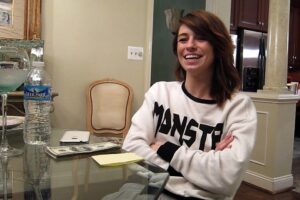 Sexy alternative babe Alena is a body-modification buff. She is heavily tattooed with multiple ear and facial piercings, connected by fine silver chains. Her short blonde hair is frosted pink, and her makeup is natural. Aside from white stockings and a cute pink collar she is naked – her many inkings include a large back piece and her breasts are perfect, with one pierced nipple. She also has a tail – a fuzzy white fake secured in place by a buttplug. Her wrists are bound behind her back, but, sitting on her haunches, she is able to reach the tail and she plays with it, letting it slide through her manicured fingers as she strokes and tugs on it. Increasingly horny, she bows forward, ass up high with her face resting against the sheets. Her beautiful body moves sinuously, and a close-up takes in every detail of her shaved pussy, oozing-moist with fleshy inner lips. Then her nylon-clad toes point as she slips her bonds and begins to masturbate. The fingers of one hand dip inside of her snatch as the others tease her clit. Alena rolls over, face twisted in ecstasy as she frigs her slit and yanks on her tail. Moaning, and rolling her blue eyes, she caresses her breasts, then sinks her polished digits inside of her. Then, needing more, she grabs a vibrating dildo from under her pillow. She works it against her clit, dipping it inside a couple times, then crams it in deep. As she reaches around from behind to plow her pussy, her free hand frigs her clit. Lust-driven, she writhes and bucks on the white sheets, then reams herself doggie-style. Now she is working the ass-plug in one hole and the dildo in the other, taking her pleasure to the next level. On her knees and screaming, she cums to an intense, shattering orgasm – then she lies back on the bed, and continues to caress her pink.