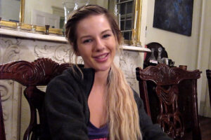 Cute brunette Kate Quinn smiles happily as she twirls so her new white dress floats up to flash her frilly white panties. She fondles her gorgeous breasts through the flimsy fabric before pulling it down to reveal that her dark nipples are hard as diamonds. Stretching out on the glass table, she tugs her underwear tight against her sex before getting naked. She parts her thighs for a first look at her shaved pussy, hands roaming over her silky skin as she kneels and wiggles her perfect ass enticingly.